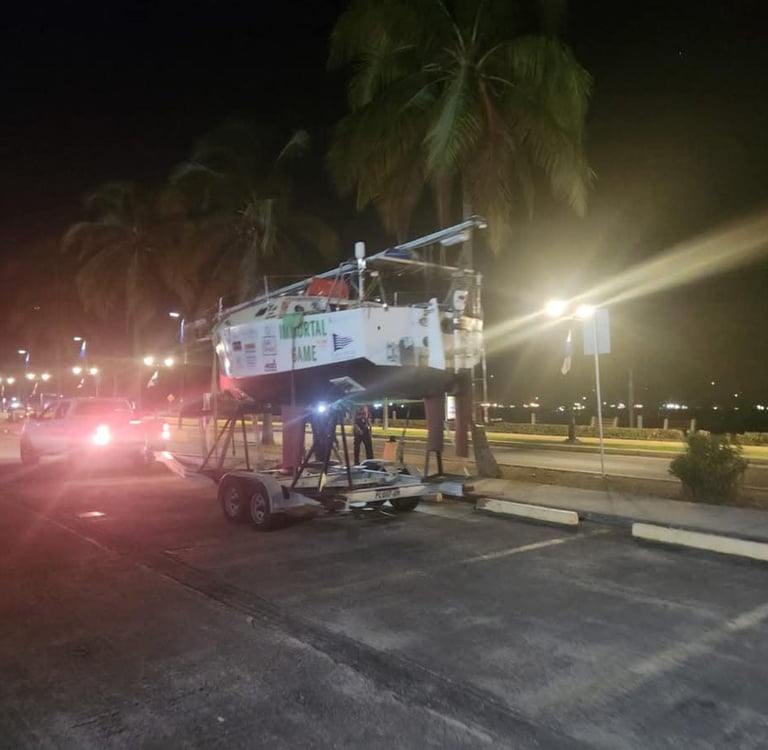 Well, there were other options. If you’ve ever been to Panama, you know you can always find someone who can ‘help’—for a price, of course. One operator suggested he could tow the fleet at the required speed, but he didn’t come cheap.(US55,000) Let’s just say Panama is full of hustlers. So, the best option was still to truck the boats 55 miles from the east to the west coast. The boats were hauled at Shelter Bay Marina, loaded onto two specially modified trailers, secured tight, and are now being transported to the ‘other’ coast. There, they will be unloaded, have their masts reinstalled, and be prepped for the next leg of the race—a 6,700-mile Pacific crossing to Fiji via Mystery Island, Tahiti, and Tonga.